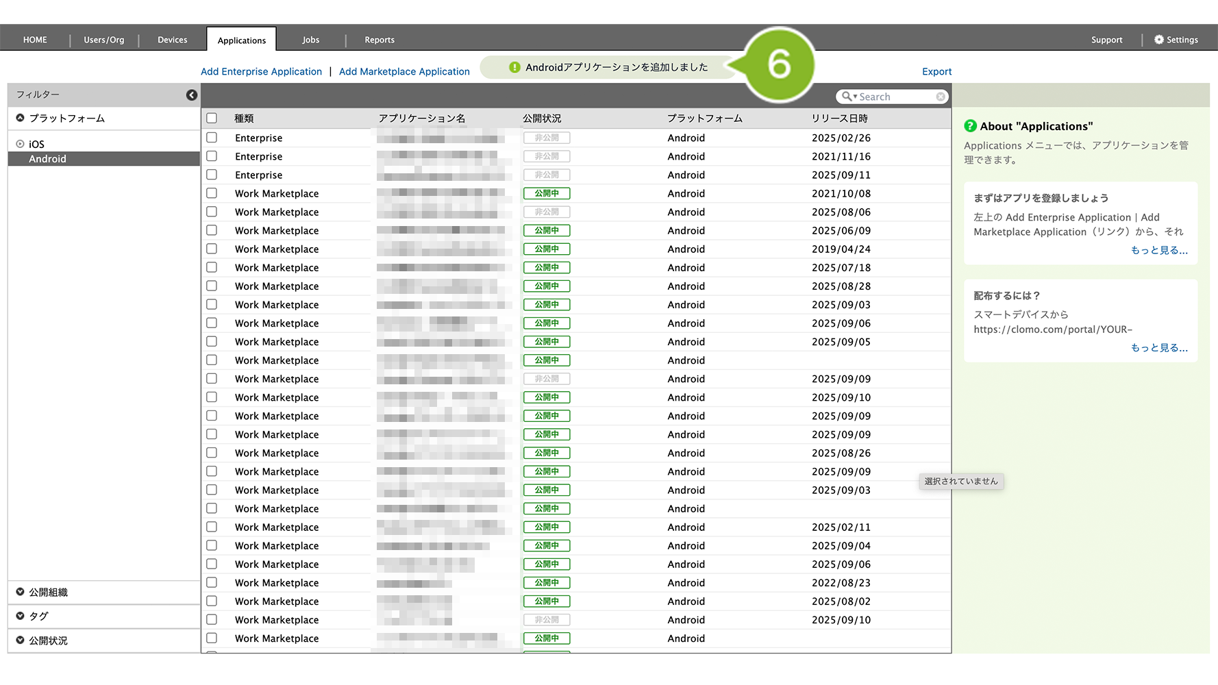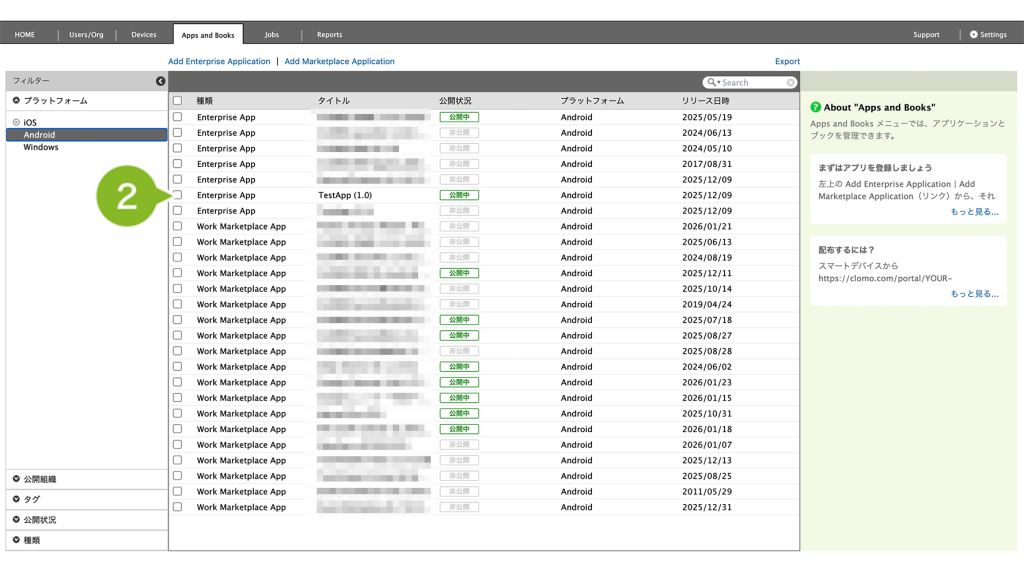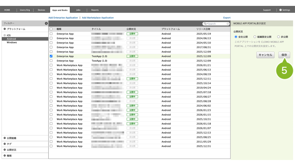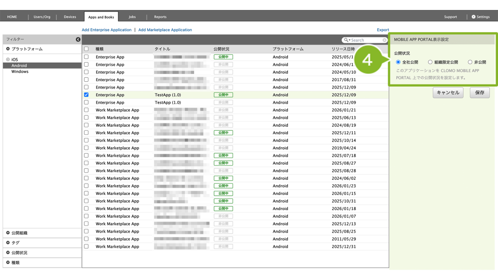 CLOMO MOBILE APP PORTAL 上での公開状況を設定することができます。