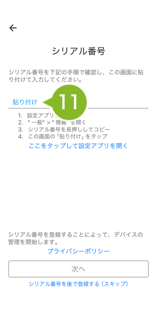 シリアル番号の入力をスキップした場合、CLOMO MDM Agent for iOS のコマンド、位置情報の取得、Jailbreak の検知がおこなえませんので、必ず入力してください。スキップしても、後ほど情報画面から入力することができます。