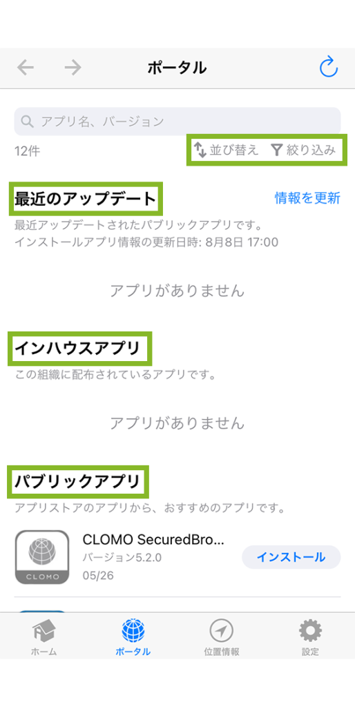 社内アプリケーション(Enterprise Application)として登録したアプリケーションのうち、CLOMO MOBILE APP PORTAL の公開設定を「公開」に設定したアプリケーションの一覧が表示されます。