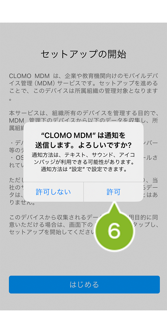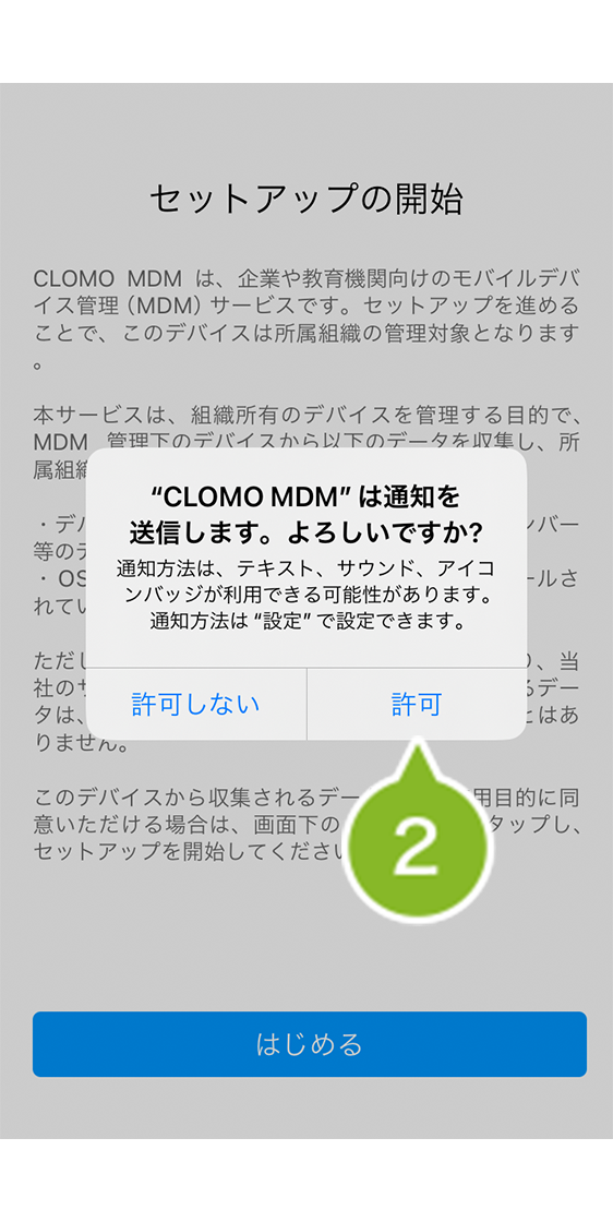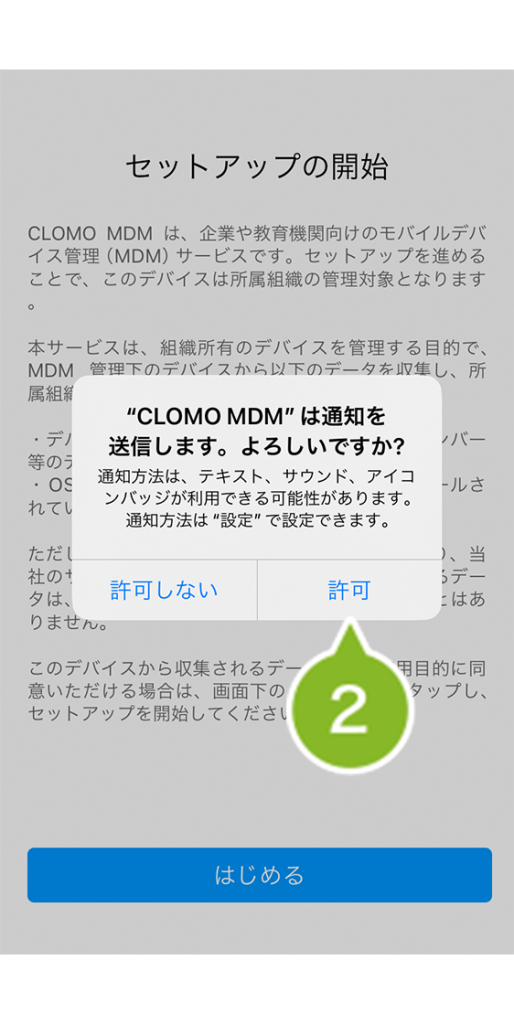 ※ 通知の許可は任意ですが、[ 許可 ] にすると、例えば CLOMO PANEL の管理者が iOS デバイスにメッセージを送信した場合に、デバイスにプッシュ通知が届きます。