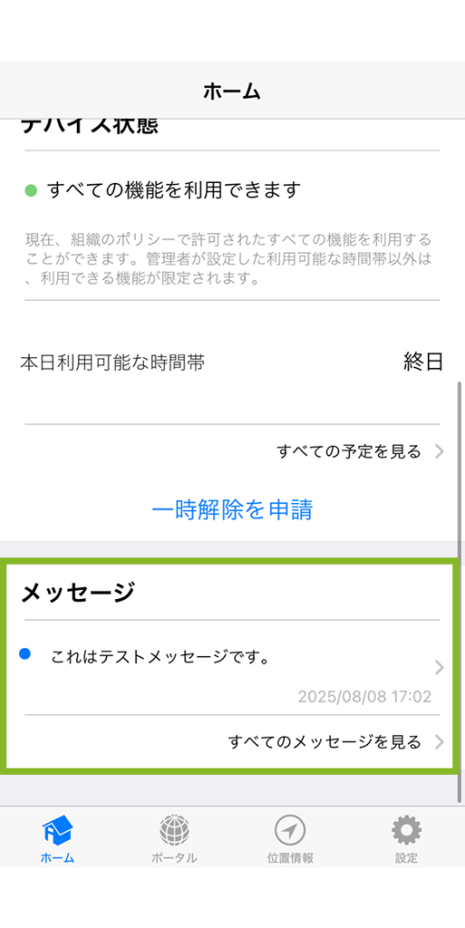 デバイスでは、以下のようにメッセージが通知され、メッセージ欄を選択することでメッセージの詳細を確認することができます。