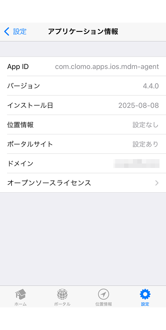 インストール済みの CLOMO MDM Agent for iOS 情報を表示します。