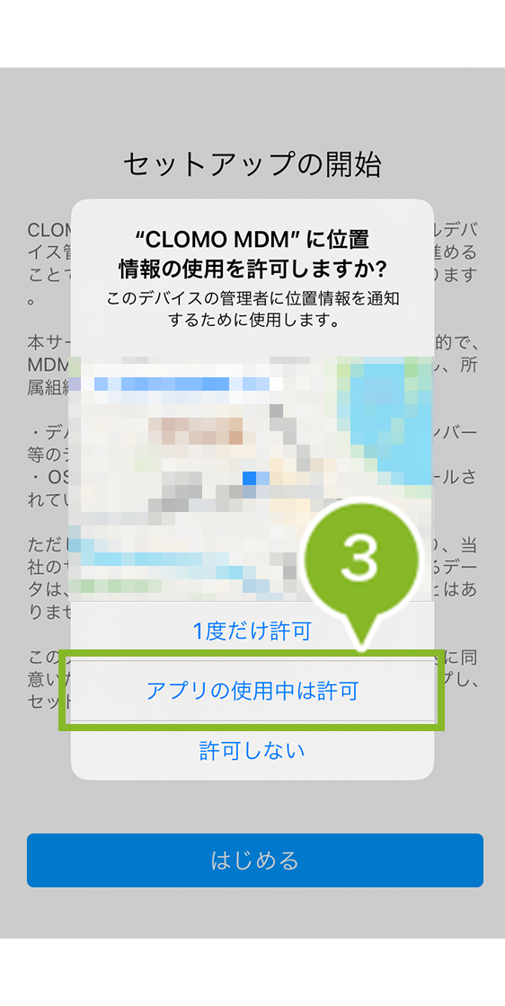 ※ 位置情報の許可は任意ですが、CLOMO MDM でデバイスの位置情報を取得する予定がある場合は、[ アプリの使用中は許可 ] を選択してください。