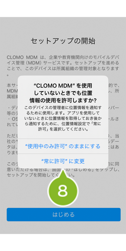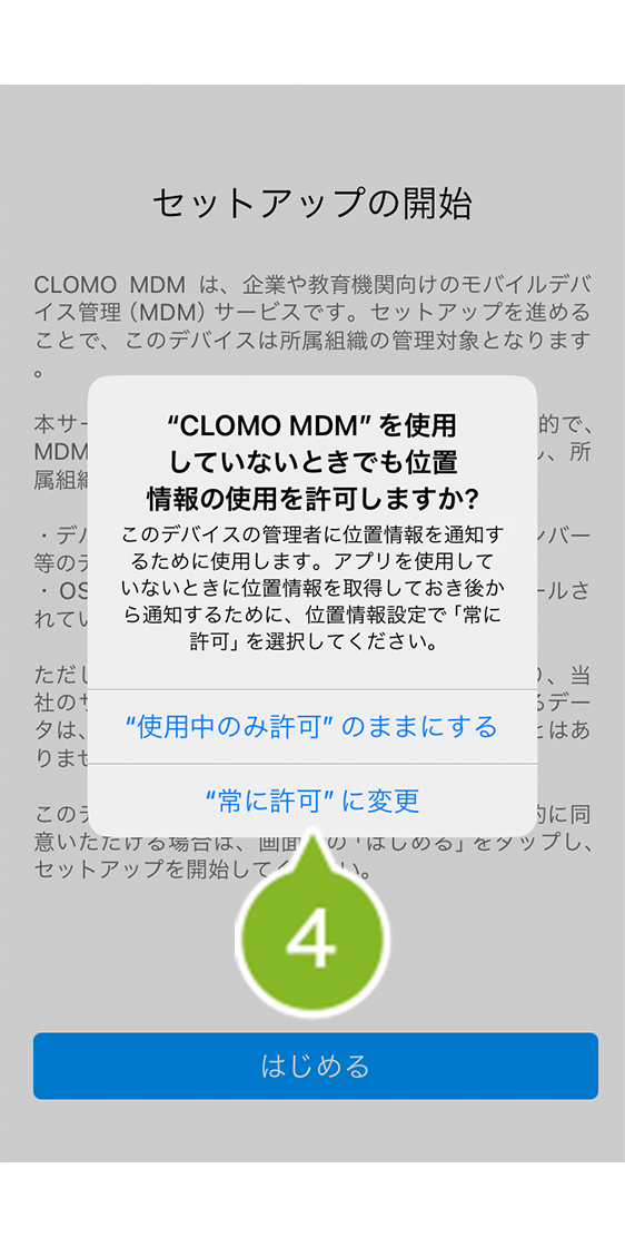 ※ 位置情報の許可は任意ですが、CLOMO MDM でデバイスの位置情報を取得する予定がある場合は、[ "常に許可" に変更 ] を選択してください。