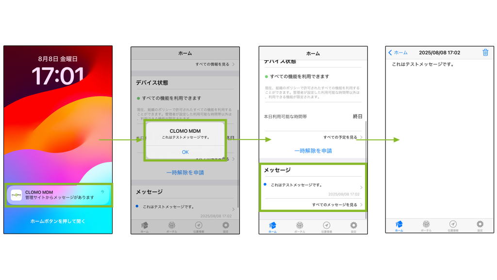 CLOMO MDM の管理者が iOS デバイスにメッセージを送信する方法は、こちらをご確認ください。