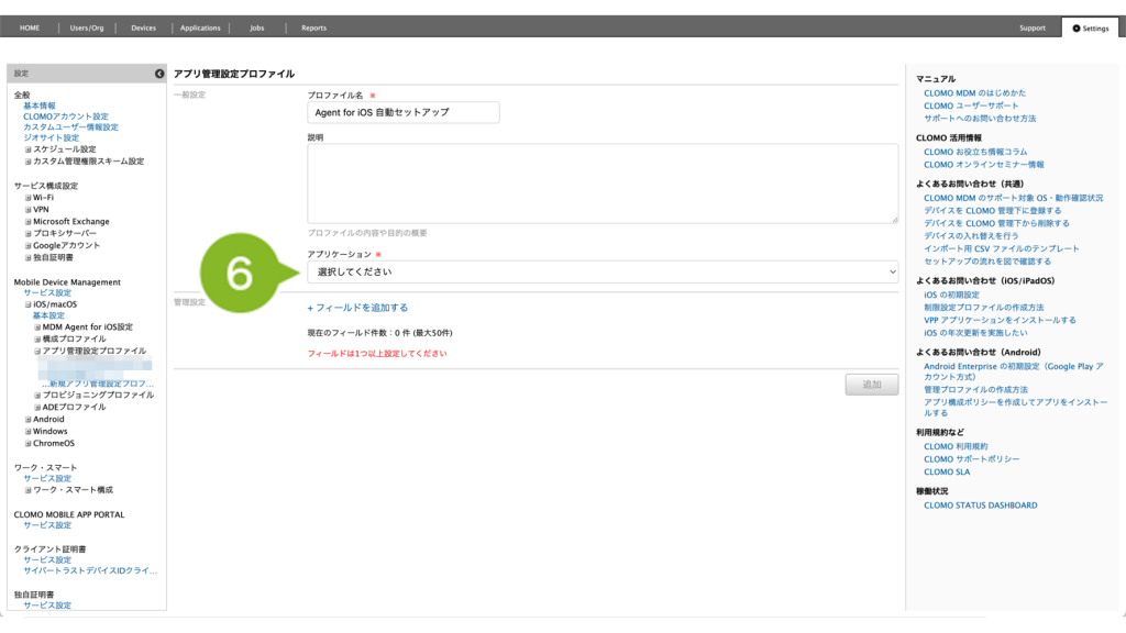 6. [ 選択してください ] から、「CLOMO MDM Agent for iOS 」を選択します。