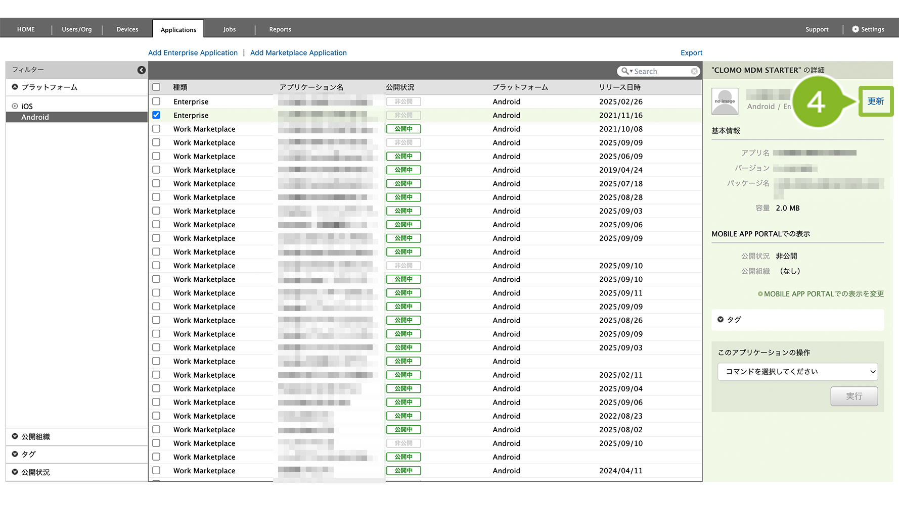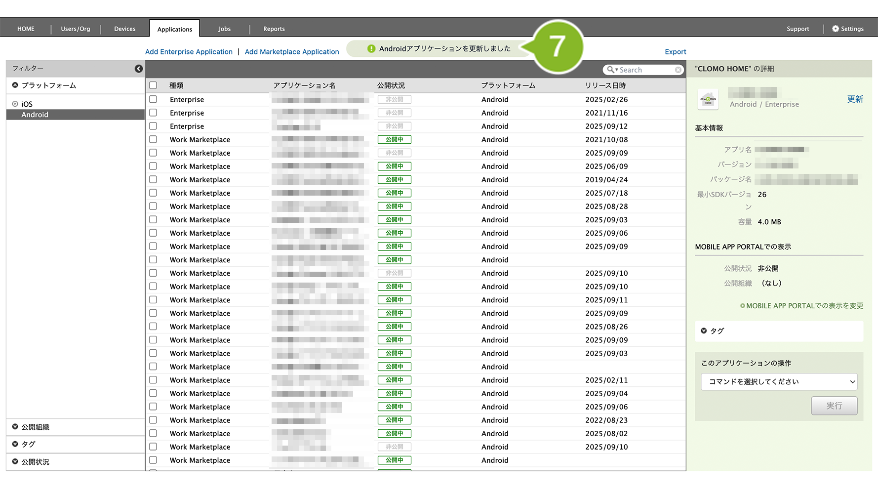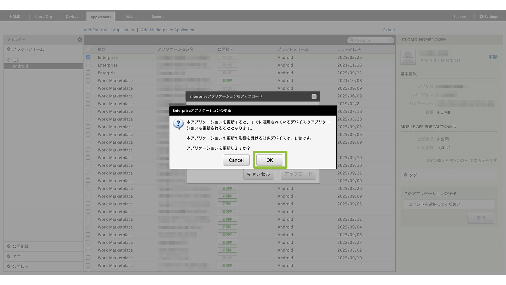 アップデートを実行するには、デバイスが Android Enterprise として管理下に登録されている、CLOMO MOBILE APP PORTAL(オプション)を契約している必要があります。