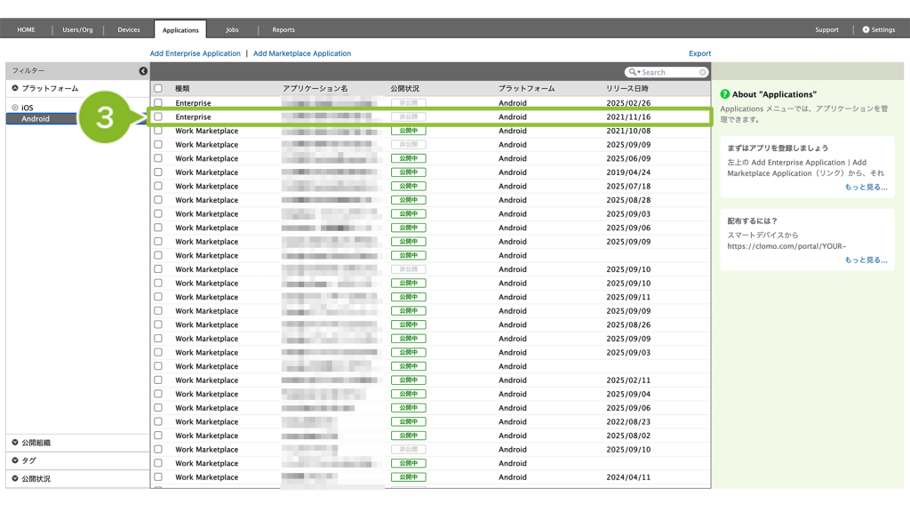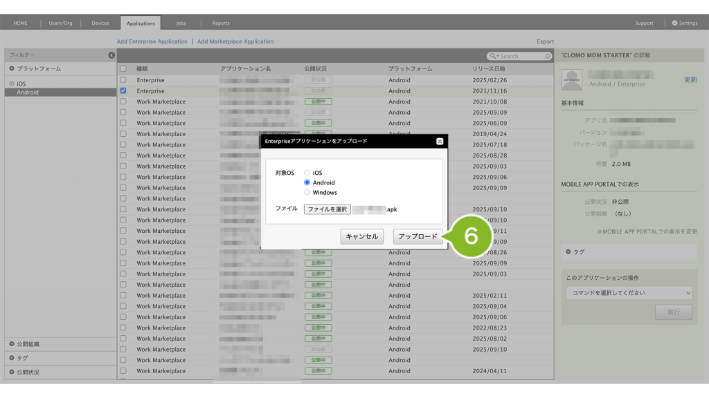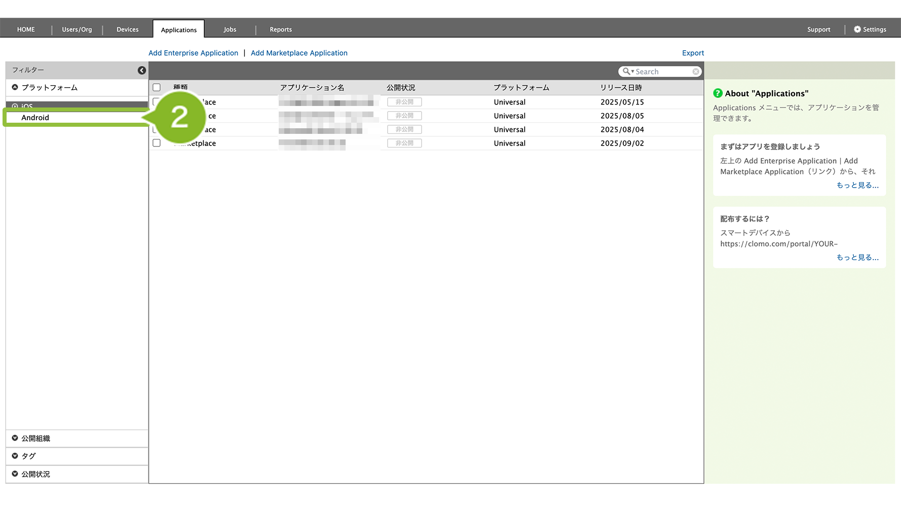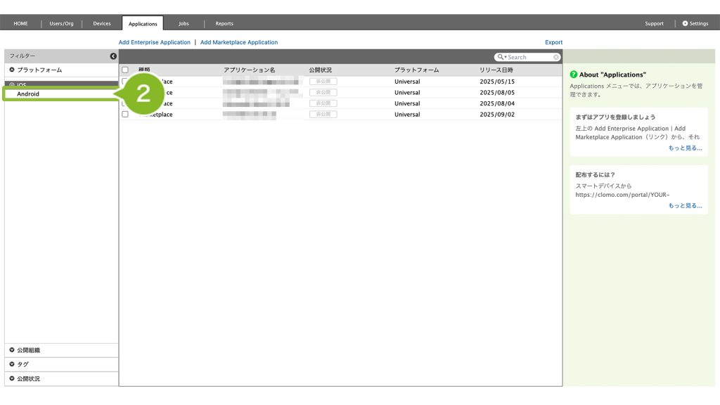 アップデートを実行するには、デバイスが Android Enterprise として管理下に登録されている、CLOMO MOBILE APP PORTAL(オプション)を契約している必要があります。