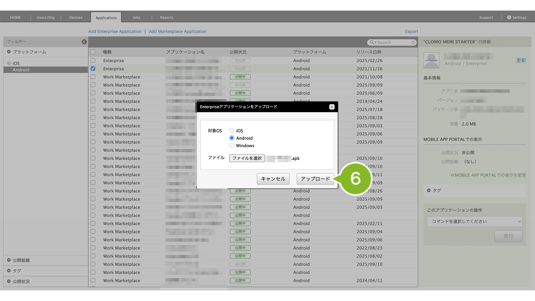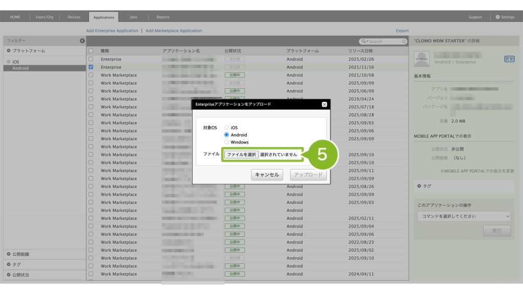 6. [編集]をクリックすると、アプリファイルの選択画面が表示されます。アップデートファイルを選択します。