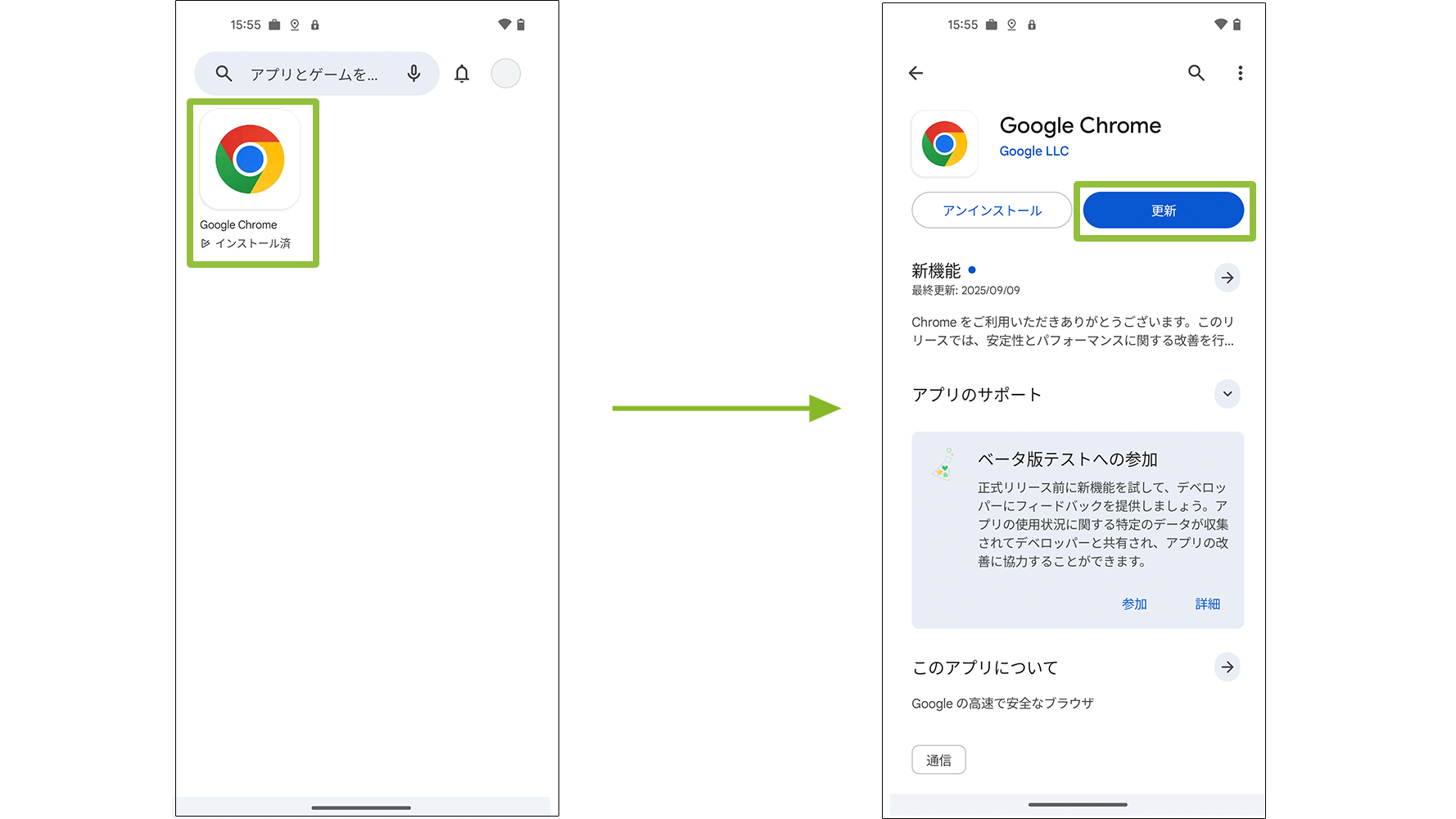 デバイス側で任意のタイミングでアップデートを実行する場合、Play ストアを立ち上げ、アップデートしたいアプリケーションを選択後[更新]をタップします。