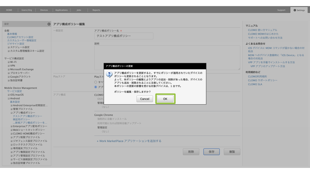 アプリ構成ポリシーが適用済みのデバイスがある場合、以下の確認画面が表示されます。確認後[OK]をクリックします。