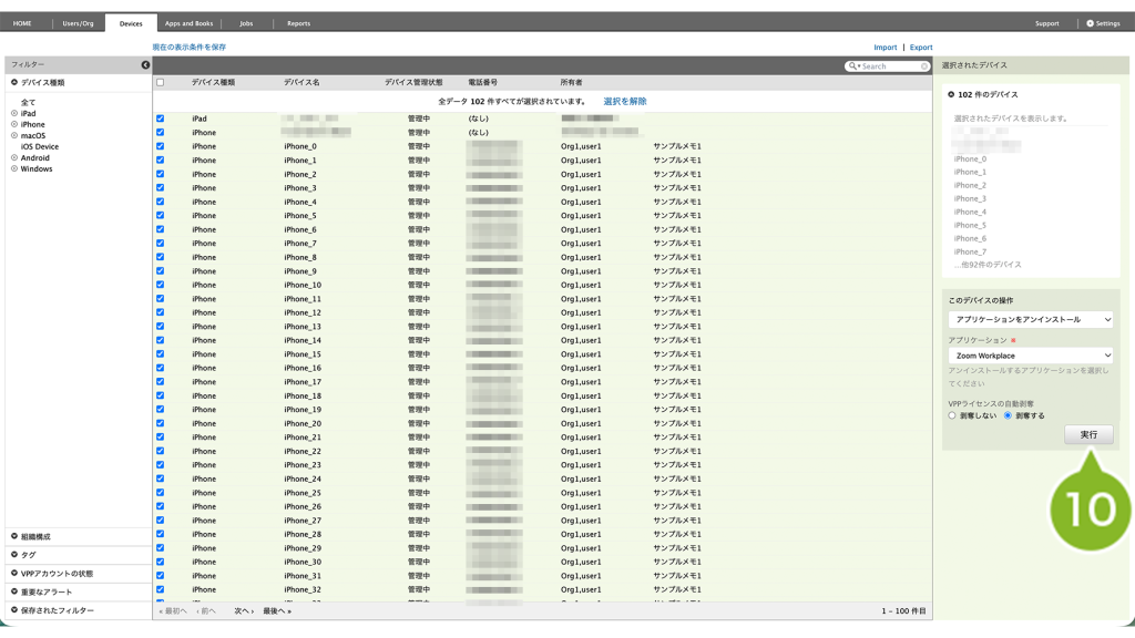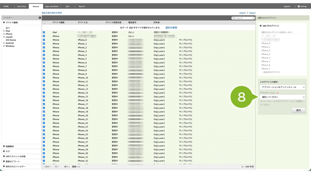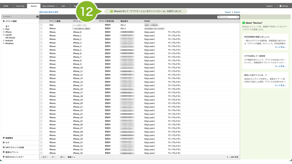- 全台を確認したい場合は、Devices 画面で「アプリケーション情報」をエクスポート(デバイス情報をエクスポート)
