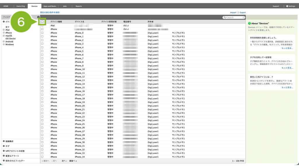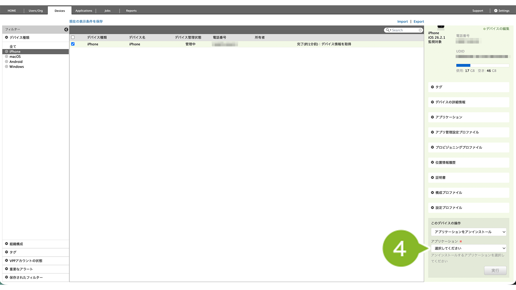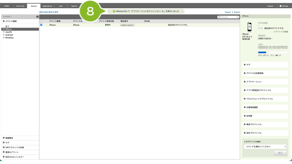 - 特定の1台を確認したい場合は、Devices 画面右側「アプリケーション」欄を確認(デバイス情報を取得・確認)