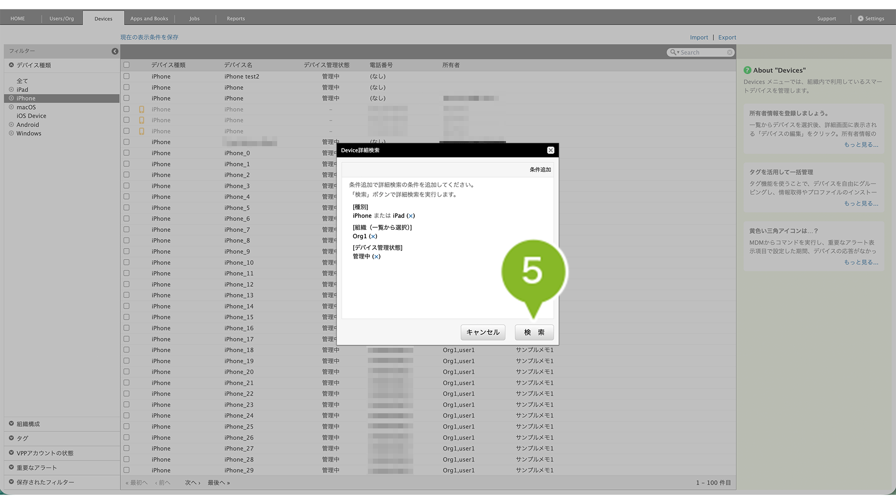 | デバイス管理状態:管理中 | MDM 構成プロファイルが削除されたデバイスや、事前予約デバイスを除くための項目です。 |