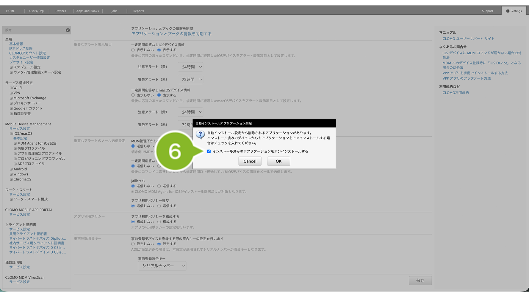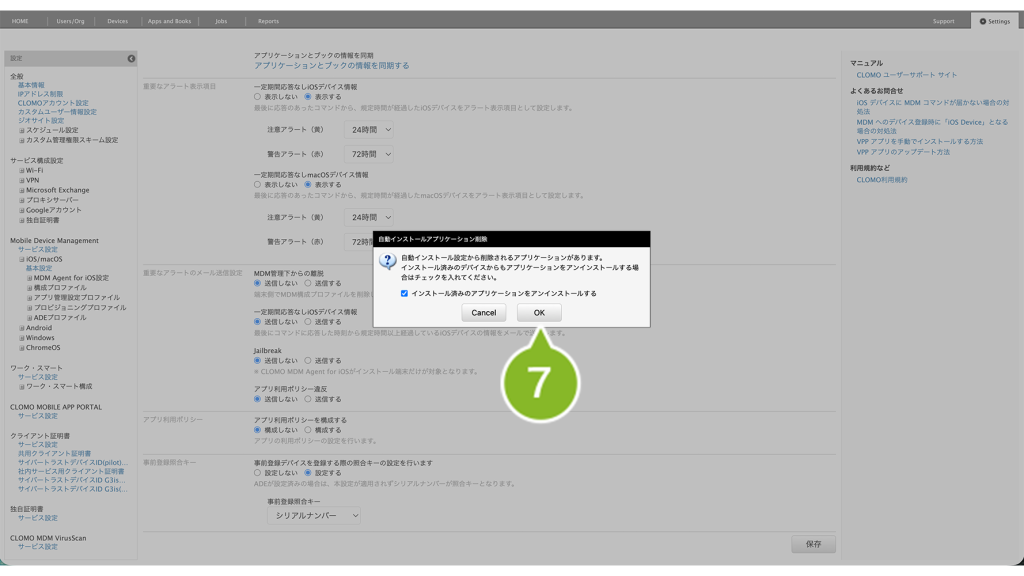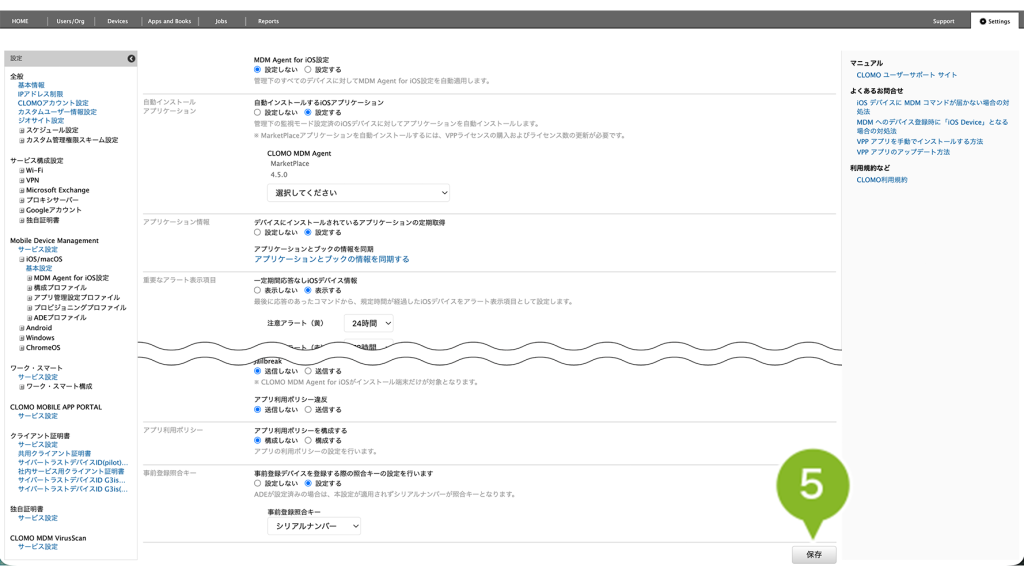 ※ 設定を保存すると、すでに管理下に登録済みの全デバイスに対して、設定内容が反映されますのでご注意ください。