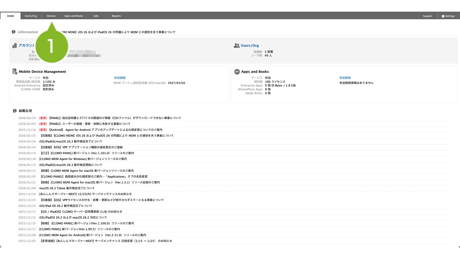 1. CLOMO PANEL にログイン後、[Devices]をクリックします。