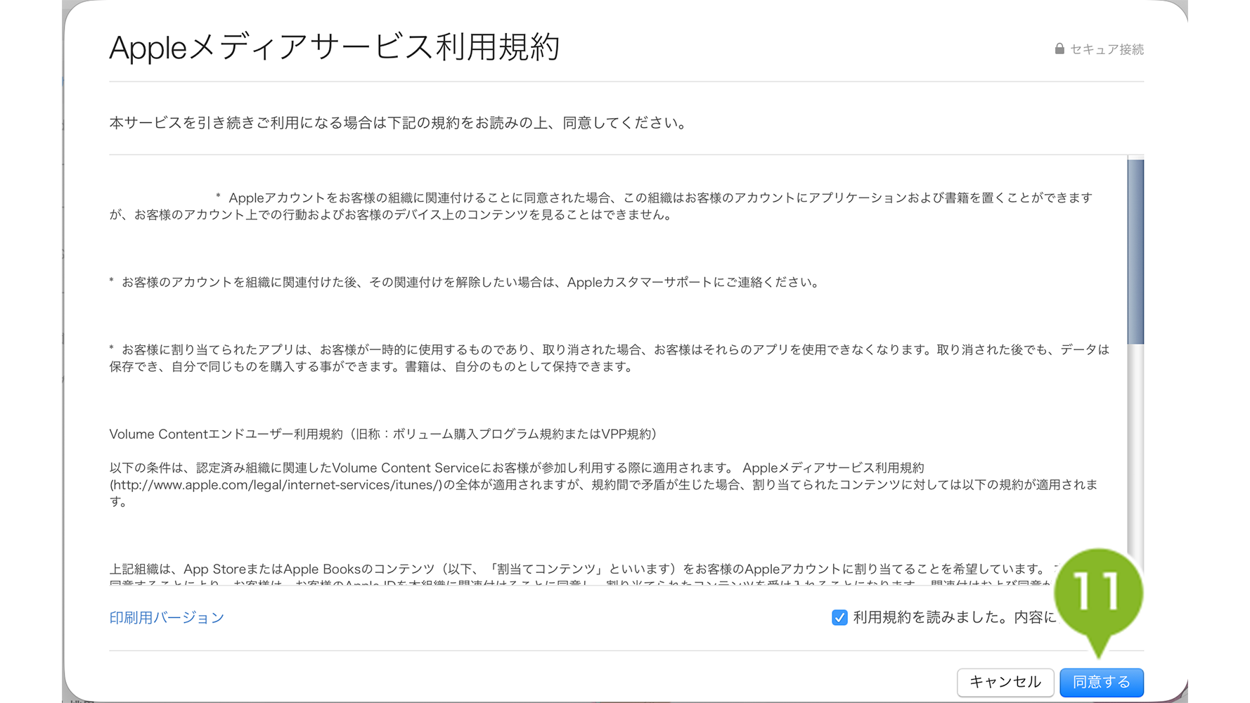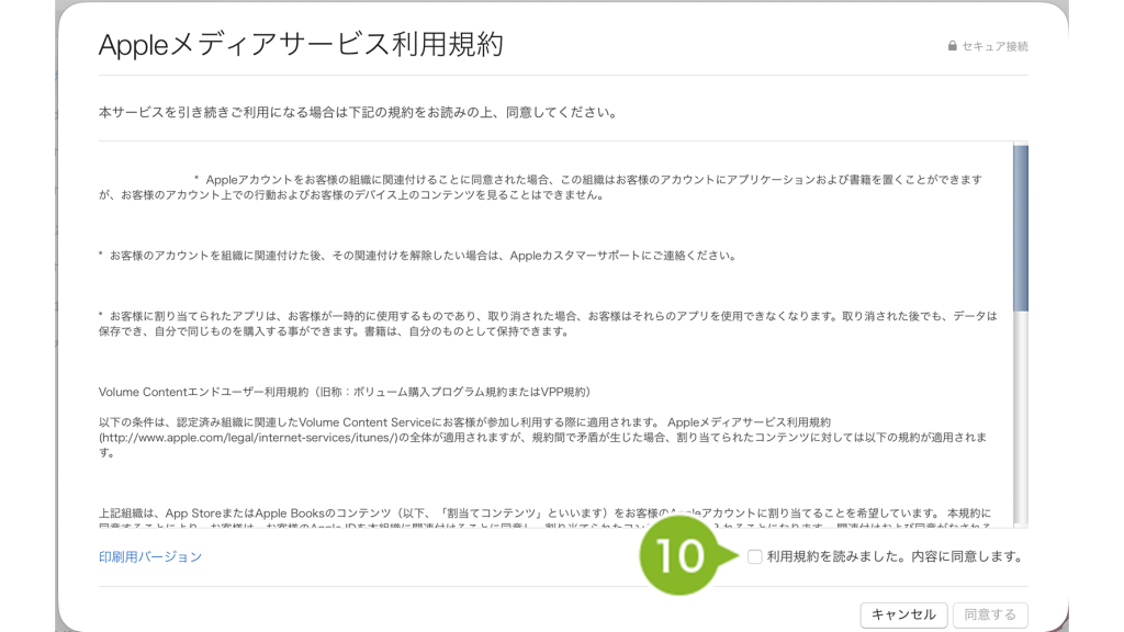 10. 利用規約を確認して、[利用規約を読みました。内容に同意します。]にチェックを入れます。