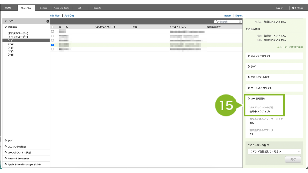 15. ユーザーを再選択して、「VPP アカウントの状態」が「使用中(アクティブ)」になれば完了です。