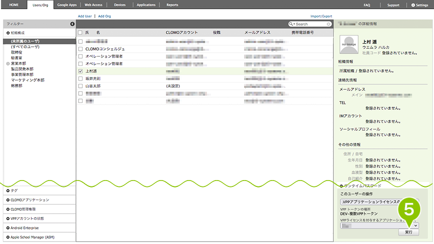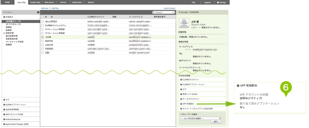 ユーザー情報の「VPP アカウント」の状態が使用中になると、VPP アプリケーションのライセンス付与ができるようになります。
