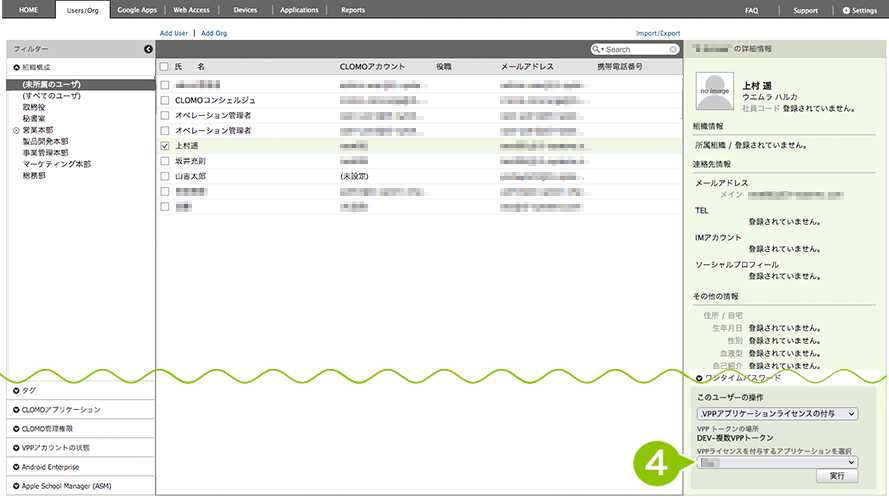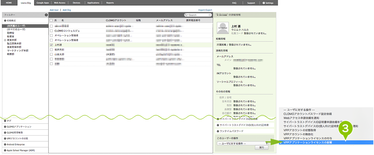3. 「このユーザーの操作」から「VPP アプリケーションライセンスの付与」をクリックします。