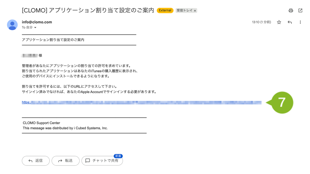 7. 招待通知を確認します。「アプリケーション割り当て設定のご案内」メールを開き、リンクをクリックします。