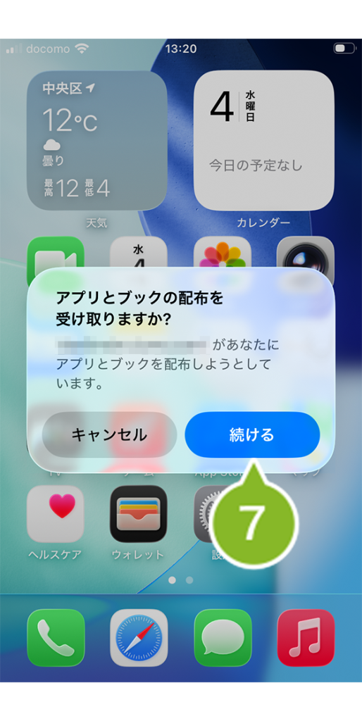 7. 招待通知を確認します。デバイスにポップアップが表示されます。[続ける]をタップします。
