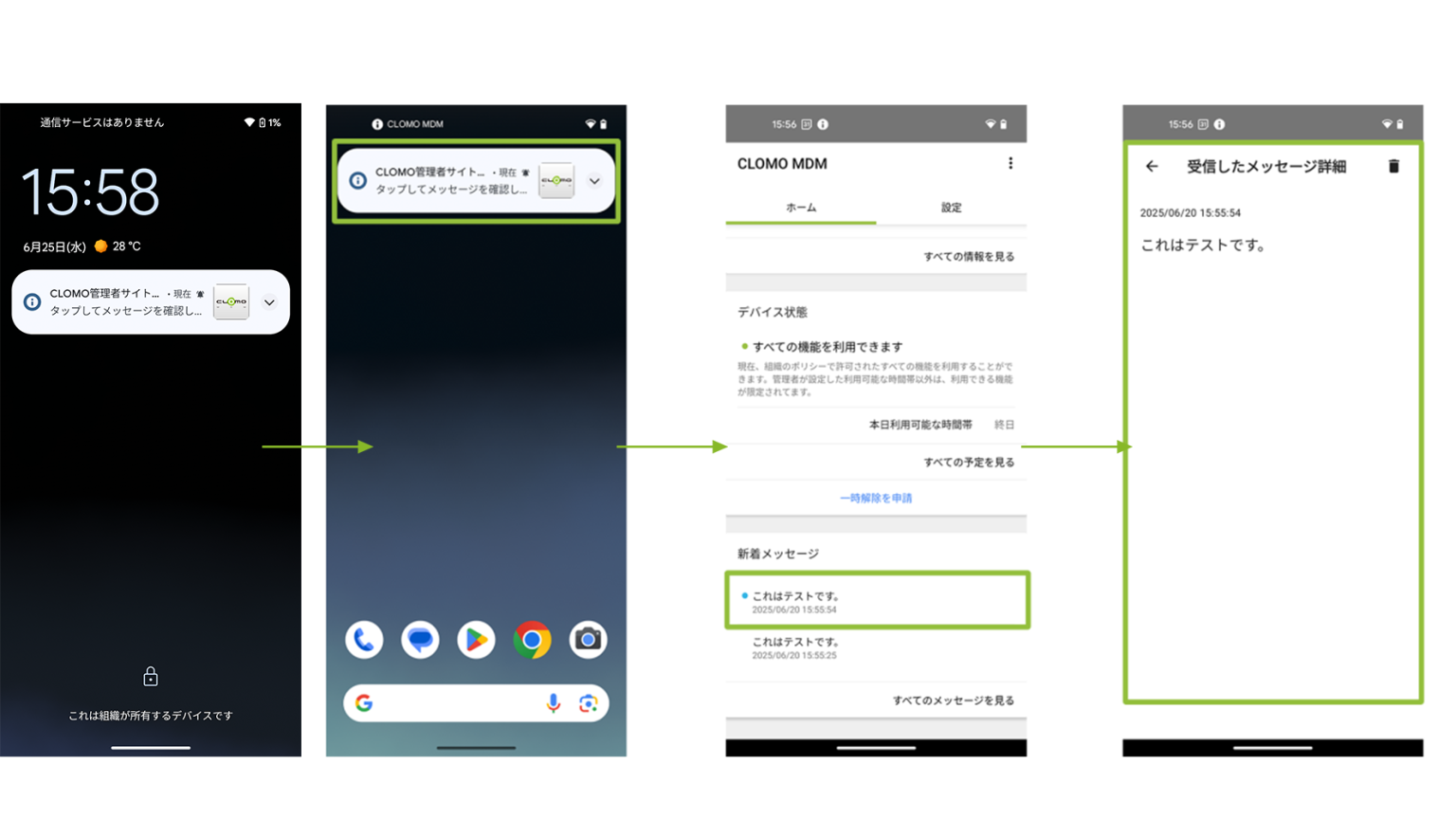 デバイスに送信されたメッセージは、CLOMO MDM Agent for Android のホーム画面から確認することができます。