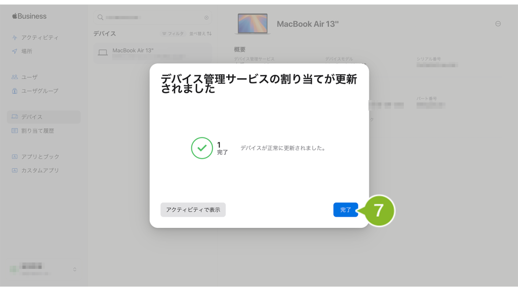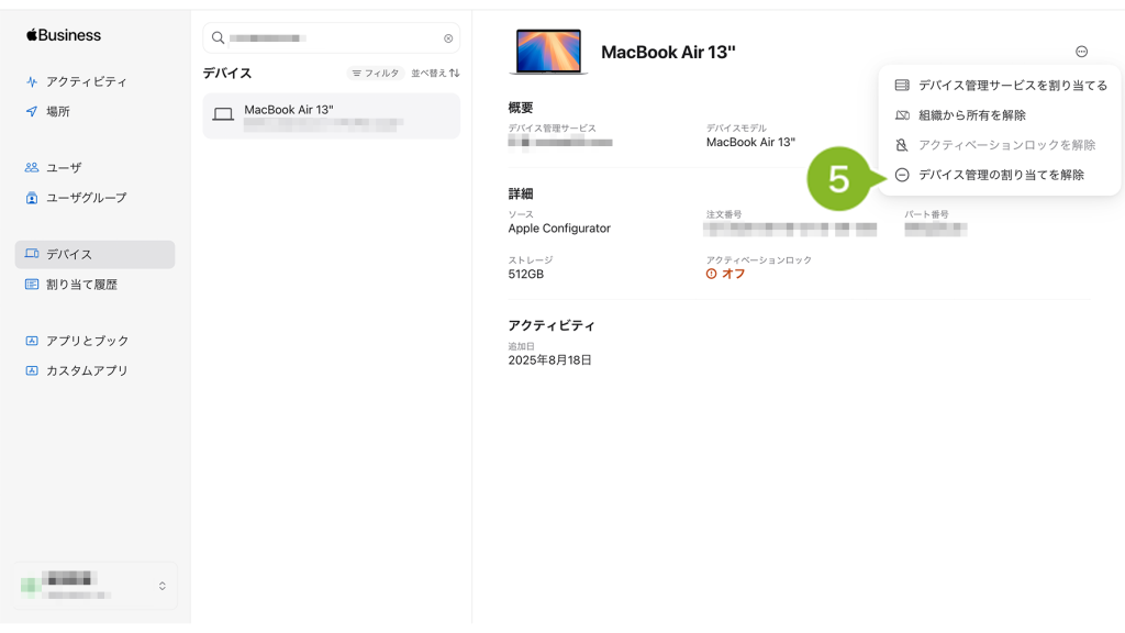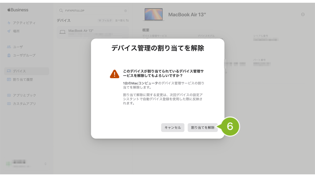 5. [デバイス管理の割り当てを解除]をクリックします。