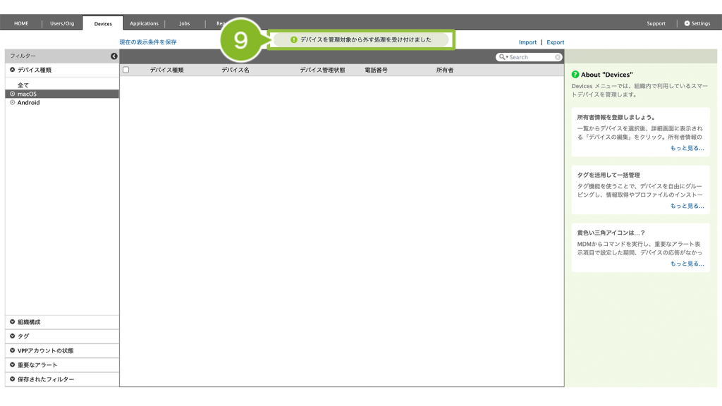 一度消費したライセンスは、デバイス情報の削除をおこなうことで再使用が可能となります。デバイス情報の削除をおこなわない場合、デバイスから MDM 構成プロファイルをアンインストールしたとしても、ライセンス数は消費したままとなります。