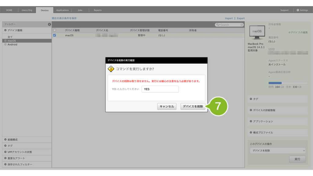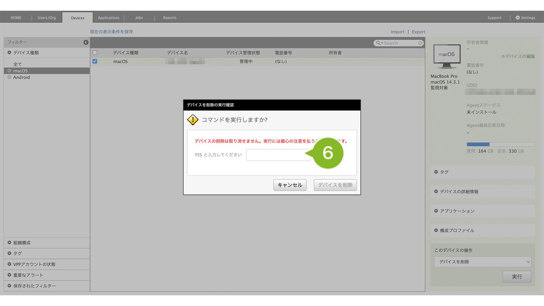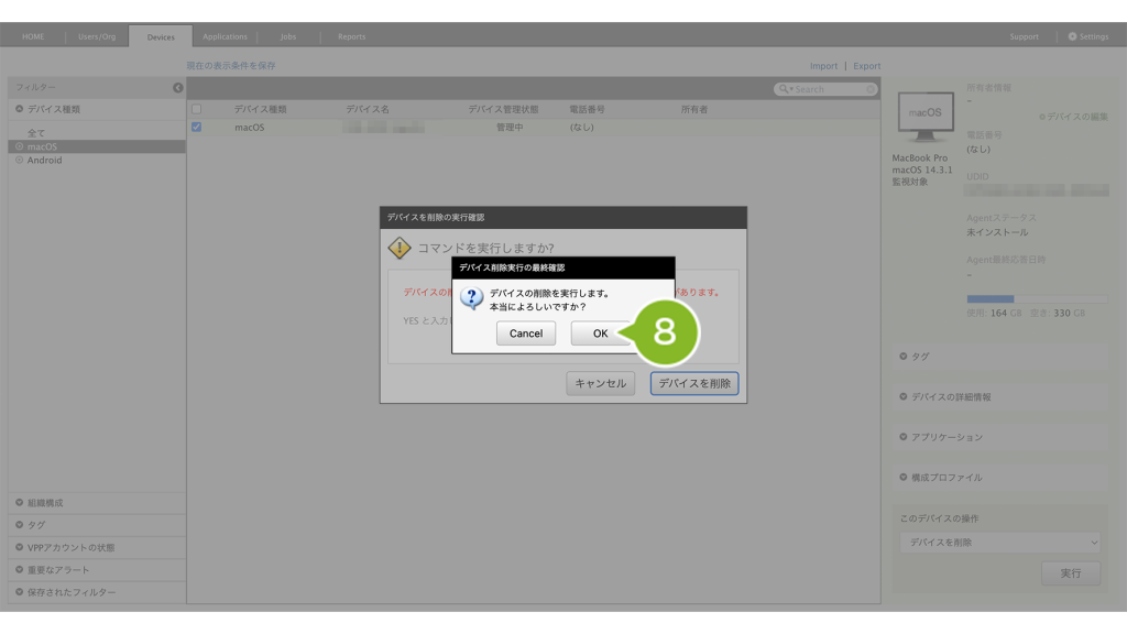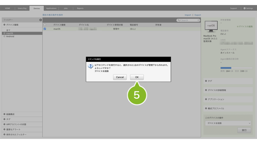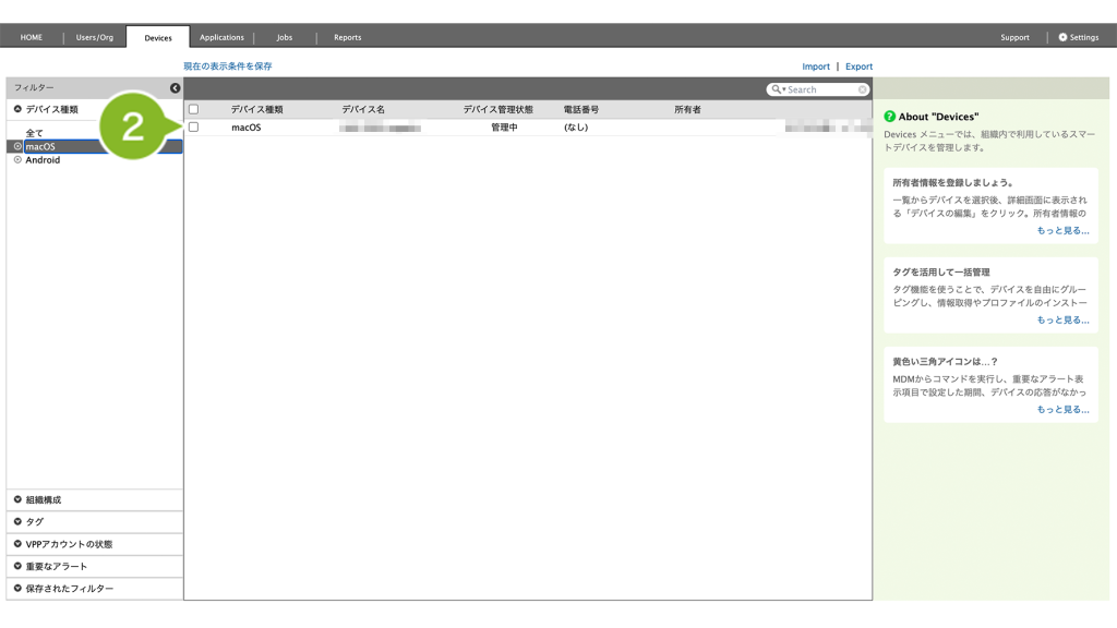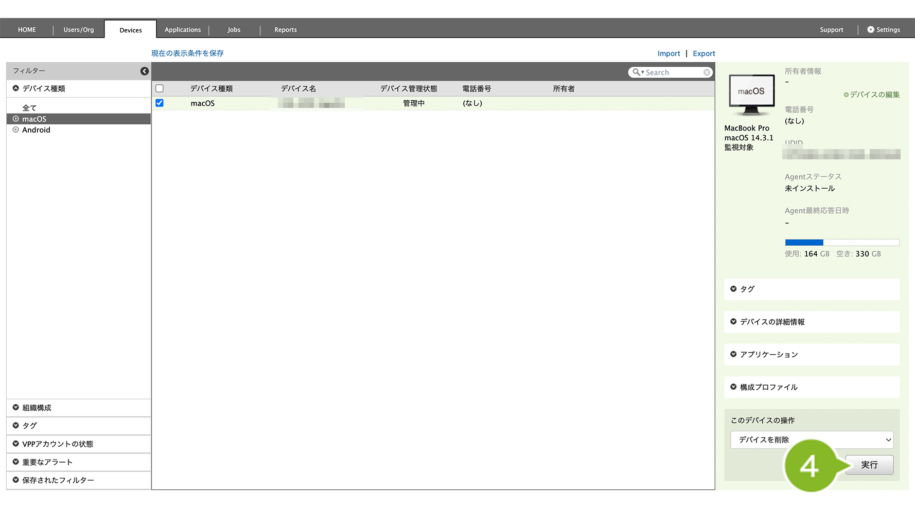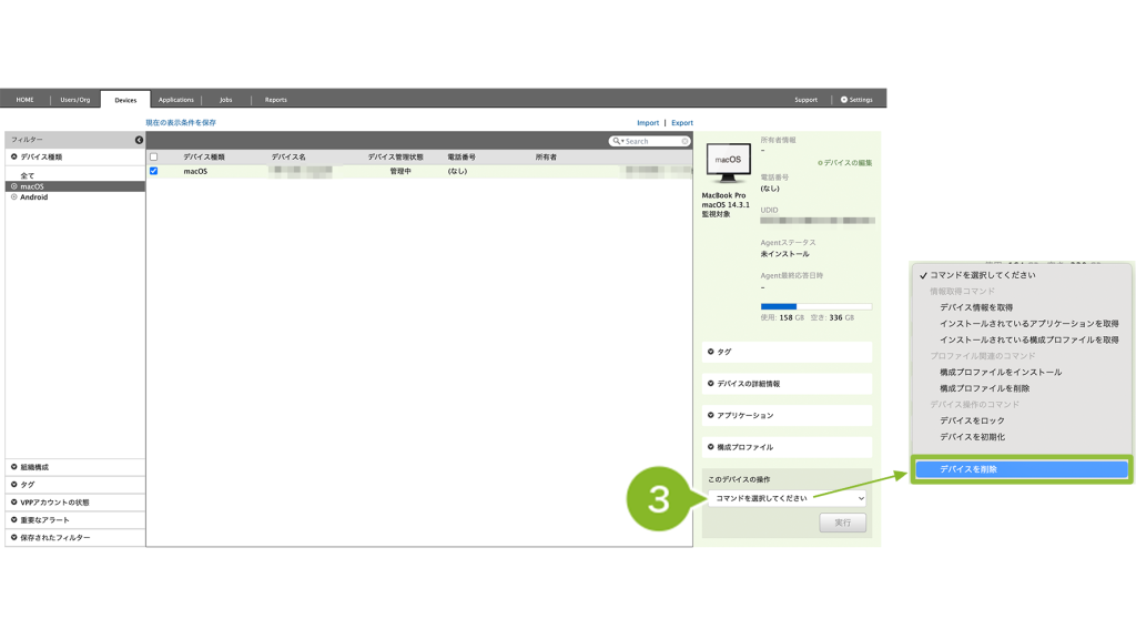 1. 「Devices」タブを選択し、初期化したい macOS を選択します。