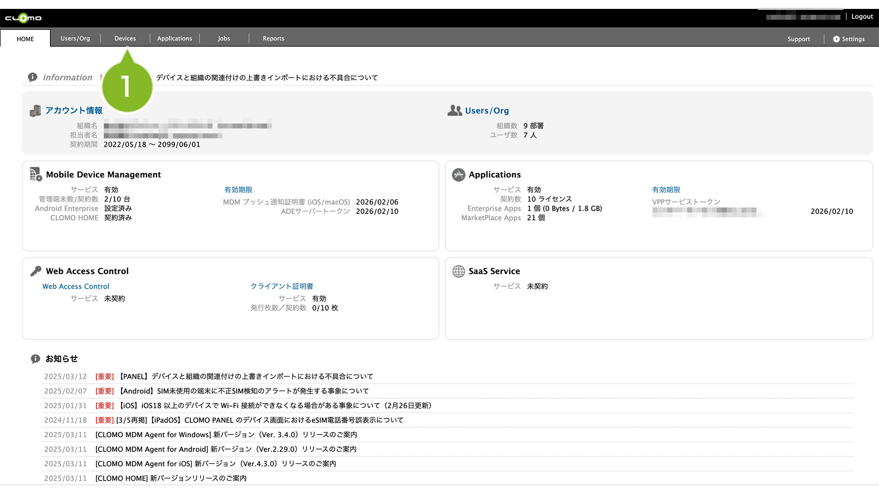1. CLOMO PANEL にログイン後、「Devices」を選択します。